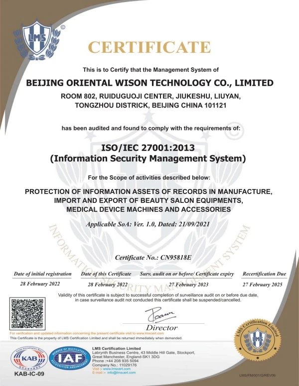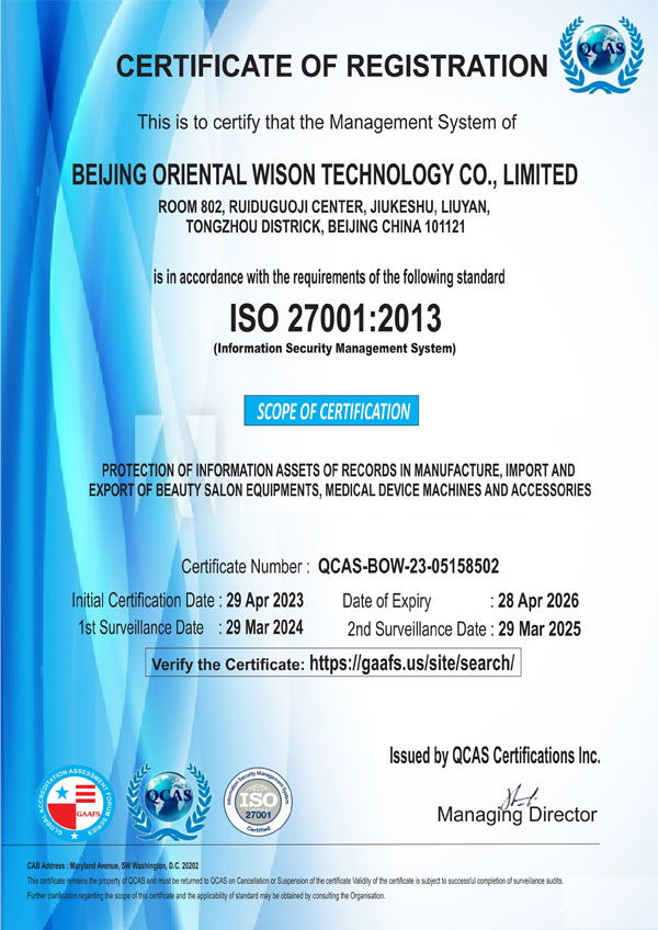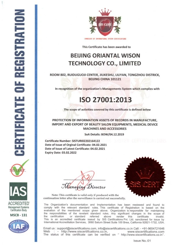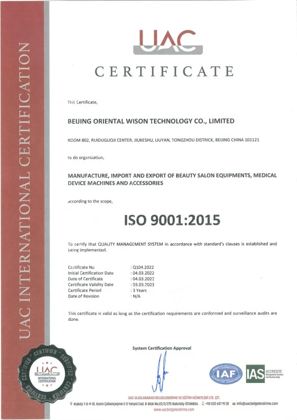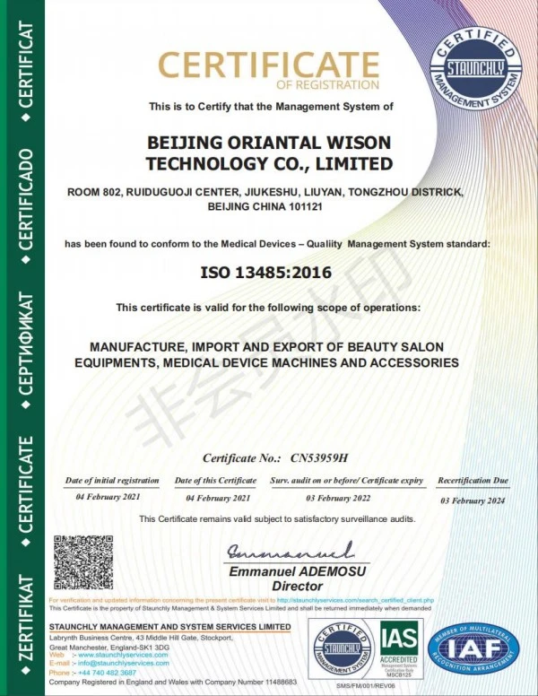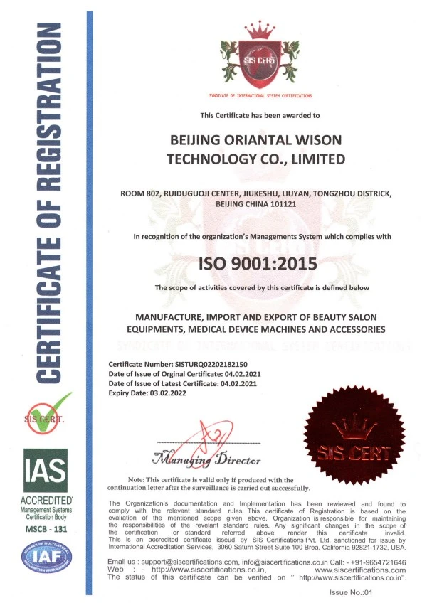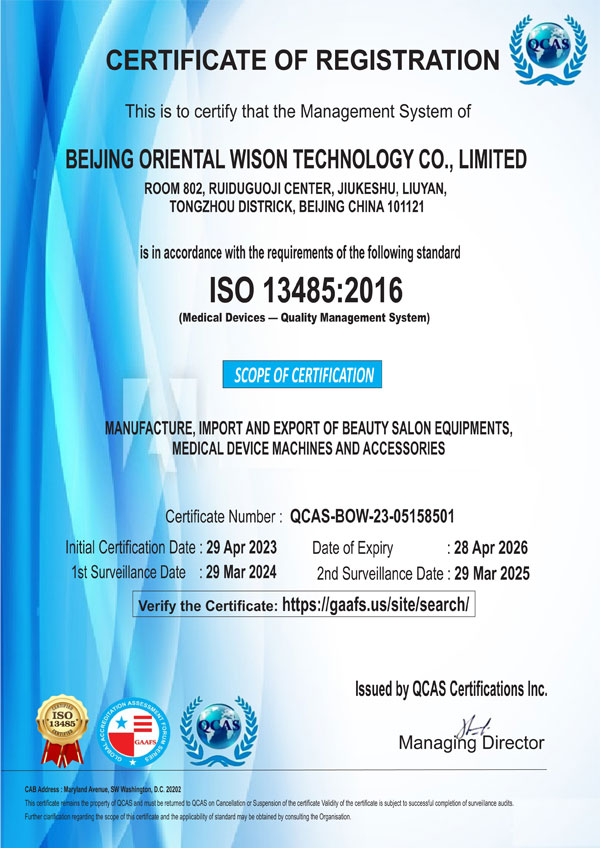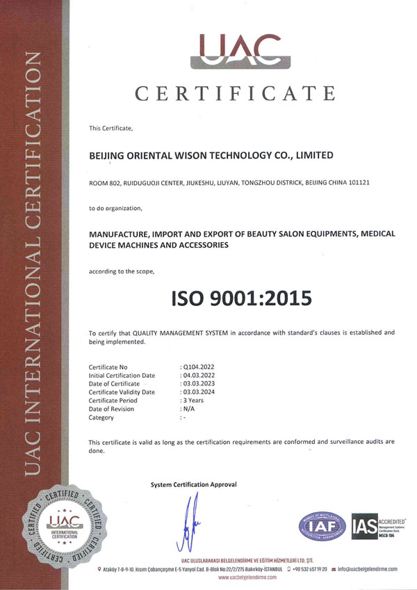 বেইজিং ওরিয়েন্টাল উইসন টেকনোলজি কোং, লিমিটেড 2002 সাল থেকে সৌন্দর্য সরঞ্জামের ক্ষেত্রে নিযুক্ত রয়েছে। আমরা বিশ্বব্যাপী একটি খুব ভাল খ্যাতি অর্জন করেছি। আমরা গবেষণা, বিকাশ, উত্পাদন, প্রশিক্ষণ, বিউটি লেজার বিউটি মেশিন বিক্রিতে একীভূত করি। আমাদের প্রোডাক্ট লাইনে এর্বিয়াম ইয়াগ লেজার, আলেকজান্ডারাইট লেজার, ডায়োড লেজার, আইপিএল লেজার, এনডি ইয়াগ লেজার, 10600 এনএম ফ্র্যাকশনাল লেজার, আরএফ মাইক্রো-নিডেল, ইএমএস মেশিন রয়েছে। আমরা বিভিন্ন দেশ থেকে OEM পরিষেবা শক্তিশালী পরিবেশক সরবরাহ করব। আমরা ইউরোপীয় সিই মেডিকেল সার্টিফিকেট, ISO13485: 2008 এবং ISO9001: 2008 আন্তর্জাতিক মান নিয়ন্ত্রণ সিস্টেম শংসাপত্র পেয়েছি।