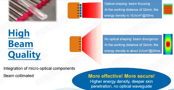 উচ্চতর মরীচি গুণমান: প্রতিটি লেজার ডায়োডের বিচ্যুতিকে সংকুচিত করার মাধ্যমে, মরীচি আরও সুনির্দিষ্ট হয়ে ওঠে, যা দ্রুত চিকিত্সা এবং বর্ধিত কার্যকারিতার অনুমতি দেয়।